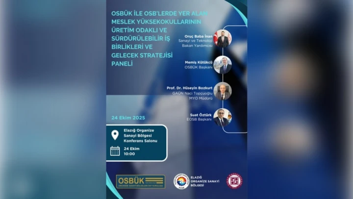 Organize Sanayi Bölgeleri Üst Kuruluşu (OSBÜK) ile Elazığ Organize Sanayi Bölgesi (EOSB) iş birliğinde, 'OSB'lerde Yer Alan Meslek Yüksekokullarının Üretim Odaklı ve Sürdürülebilir İş Birlikleri ile Gelecek Stratejisi' konulu panel düzenlenecek.