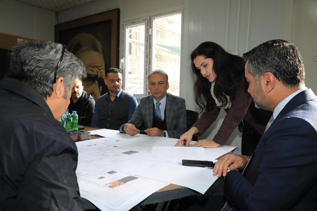 Tarihi Öğretmenevi’nde yürütülen güçlendirme çalışmalarını uzman ekiplerle birlikte yerinde inceleyen Başkan Şerifoğulları, çalışmalardaki son duruma ilişkin bilgiler aldı.