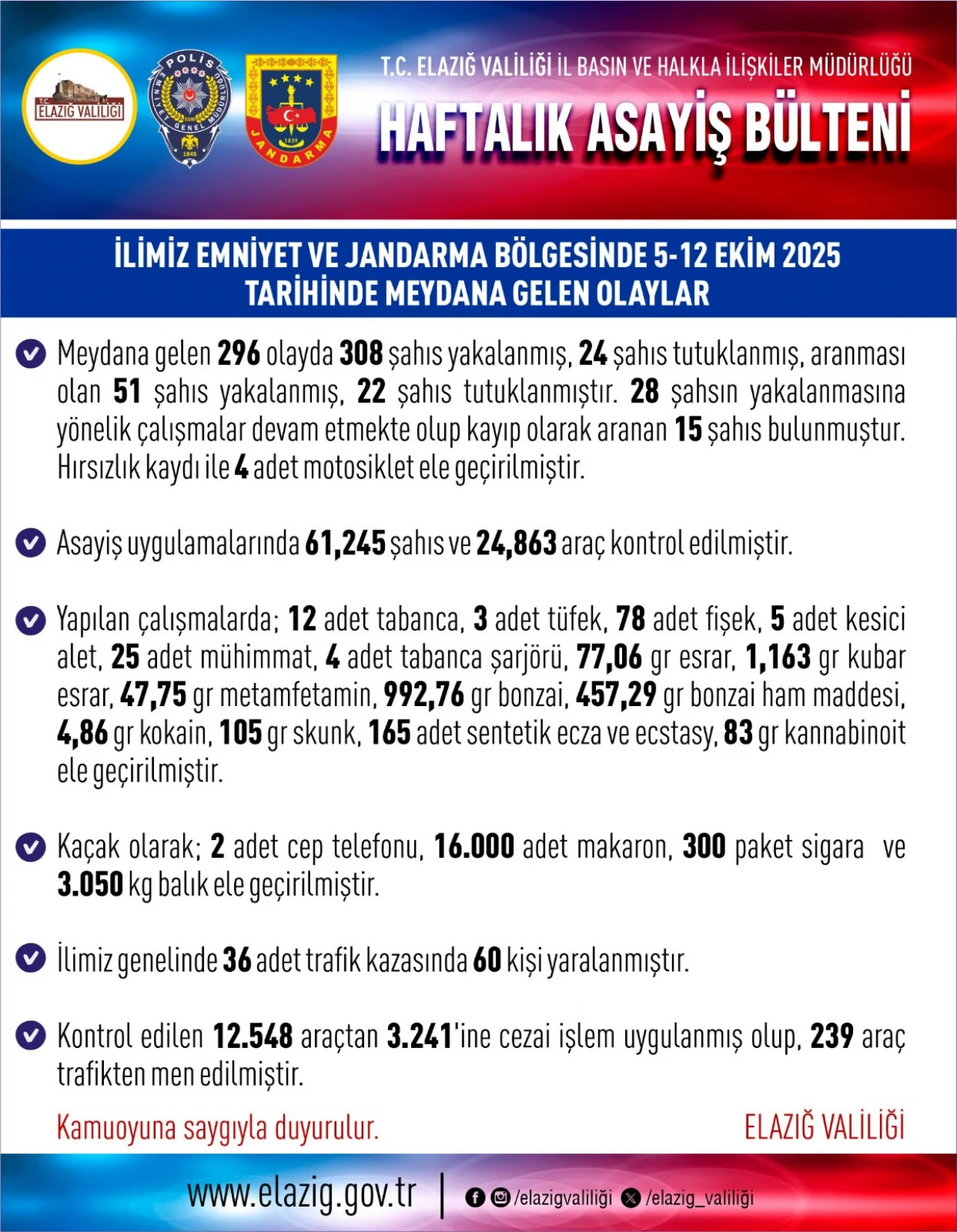 Elazığ Valiliği, 5-12 Ekim 2025 tarihleri arasındaki haftalık asayiş raporunu kamuoyuyla paylaştı.