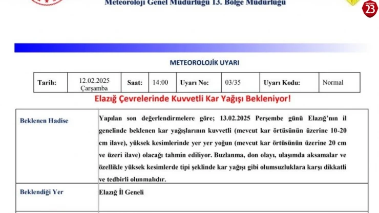 Meteoroloji 13. Bölge Müdürlüğü, Elazığ genelinde 13 Şubat 2025 Perşembe günü etkili olması beklenen kuvvetli kar yağışı konusunda vatandaşları uyardı.