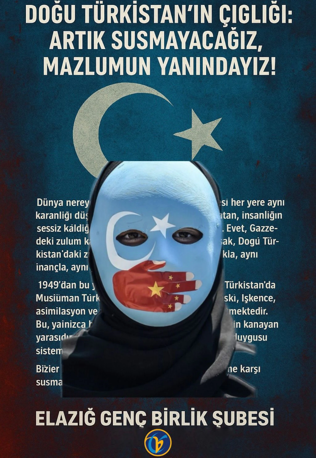 Genç Birlik Elazığ İl Başkanı Mustafa Taha Ateş, Doğu Türkistan'da yaşanan insan hakları ihlallerine dikkat çekerek, 'Zulme karşı susmayacağız, Doğu Türkistanlı kardeşlerimizin yanındayız' dedi.